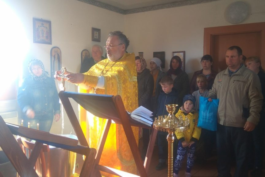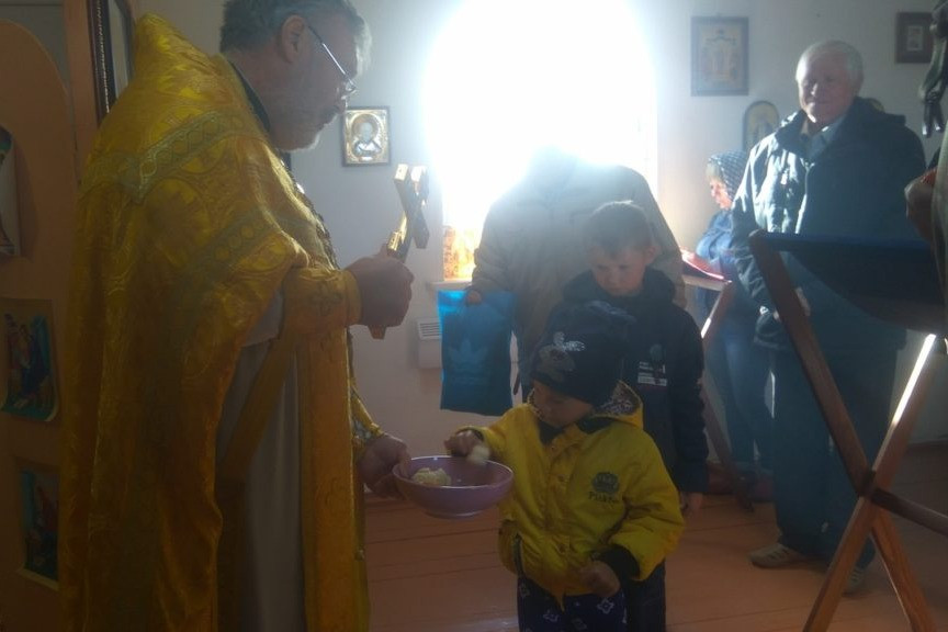 По окончании Божественной Литургии был совершен водосвятный молебен и состоялось первое в селе Таинство Крещения.